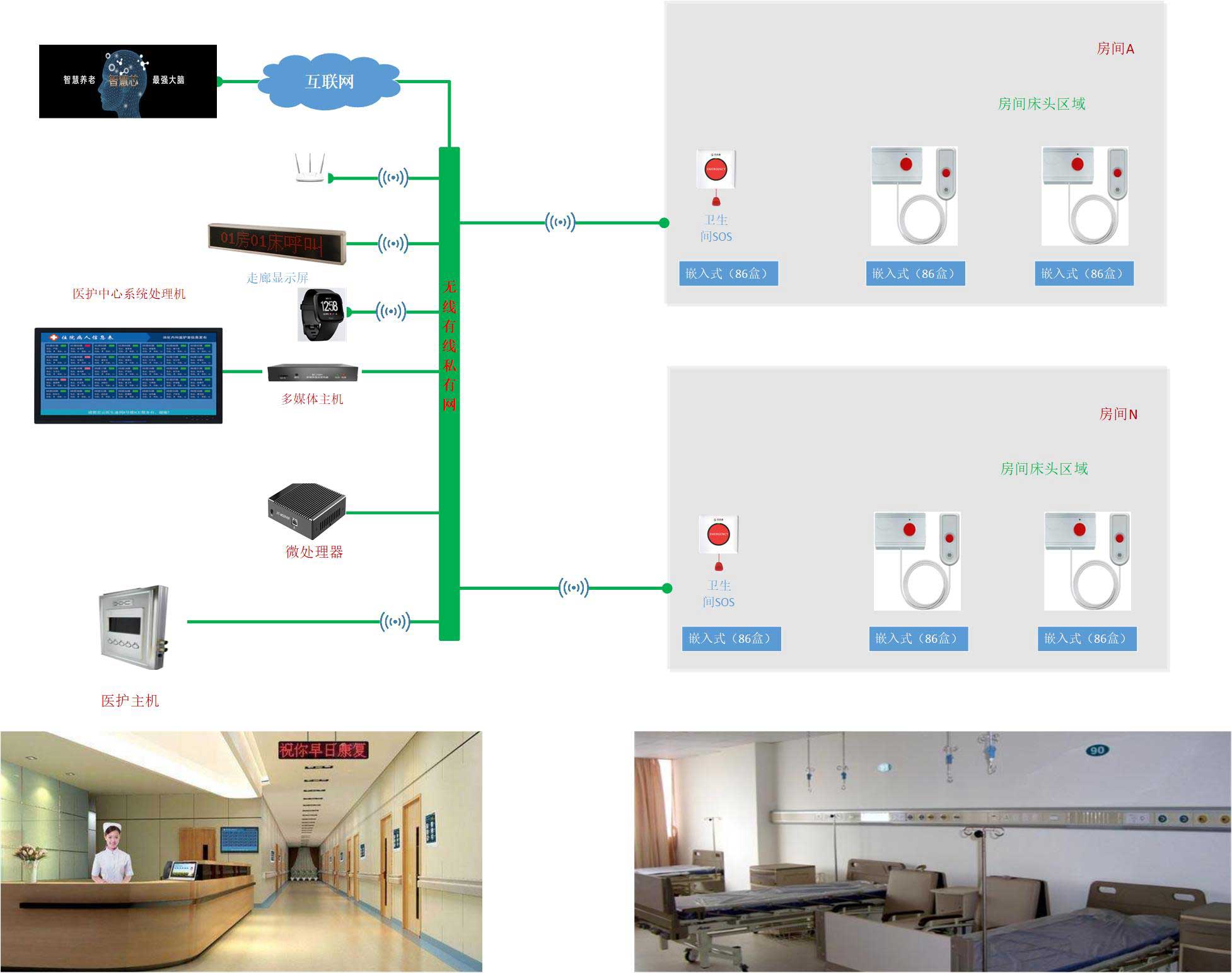 在每個床頭布放無線或有線呼叫器,基于 IP 網(wǎng)絡或無線網(wǎng)絡通訊技術,由床位分機、照護站主機、微服務器、走廊顯示屏、護士站床位信息顯示屏和移動APP等組成。它們通過網(wǎng)絡交換機建立雙向連接,數(shù)據(jù)互通,可實現(xiàn)呼叫對講或?qū)崟r呼叫,護理主機能實時播報哪個房間哪個床位呼叫,護理人員的手機上同步收到房間老人的呼叫。可以顯示護理信息、查詢等多種功能。